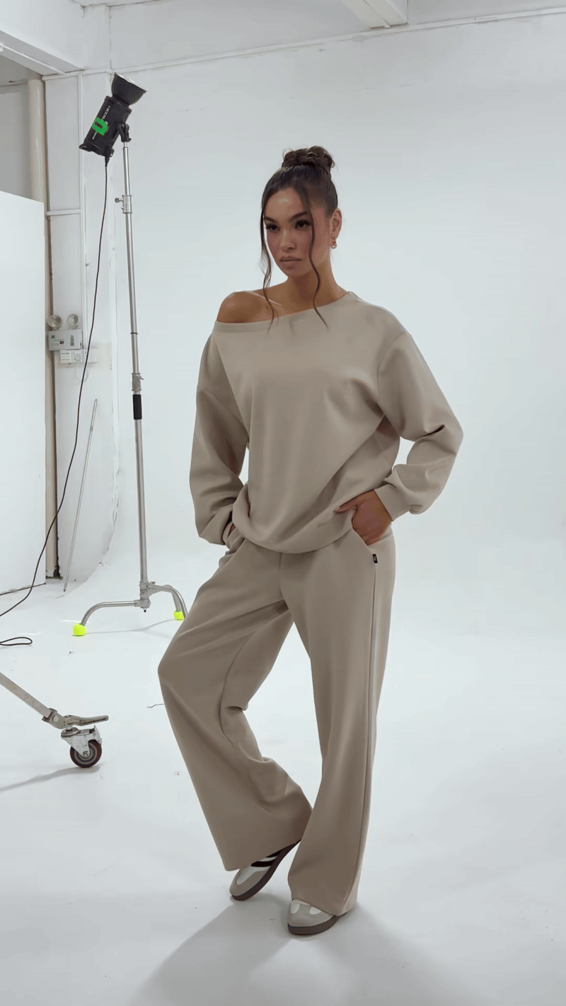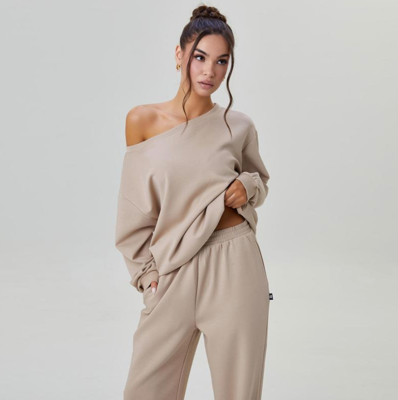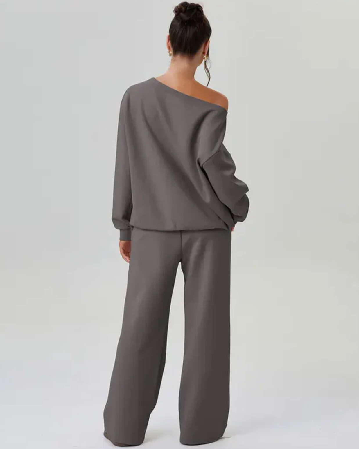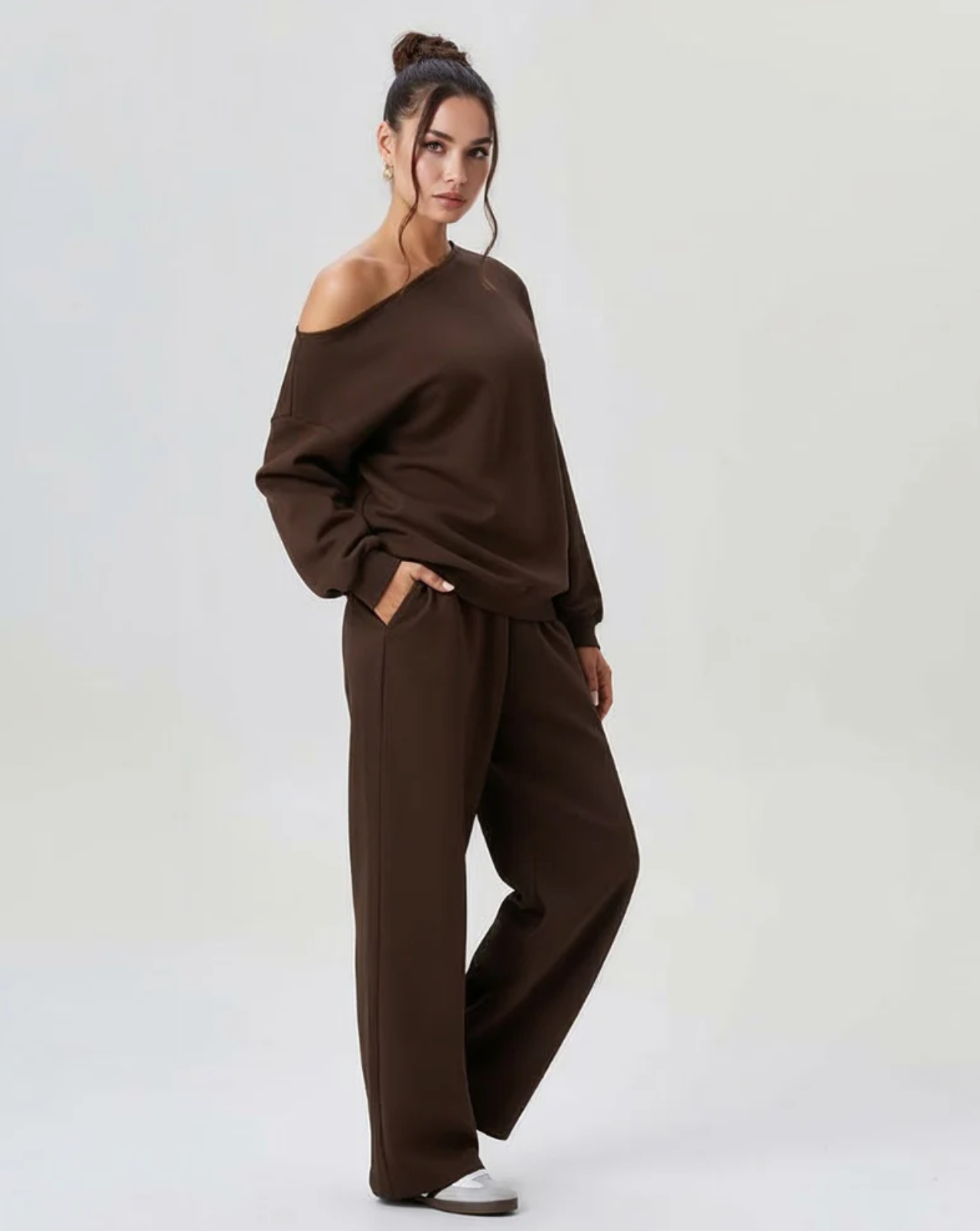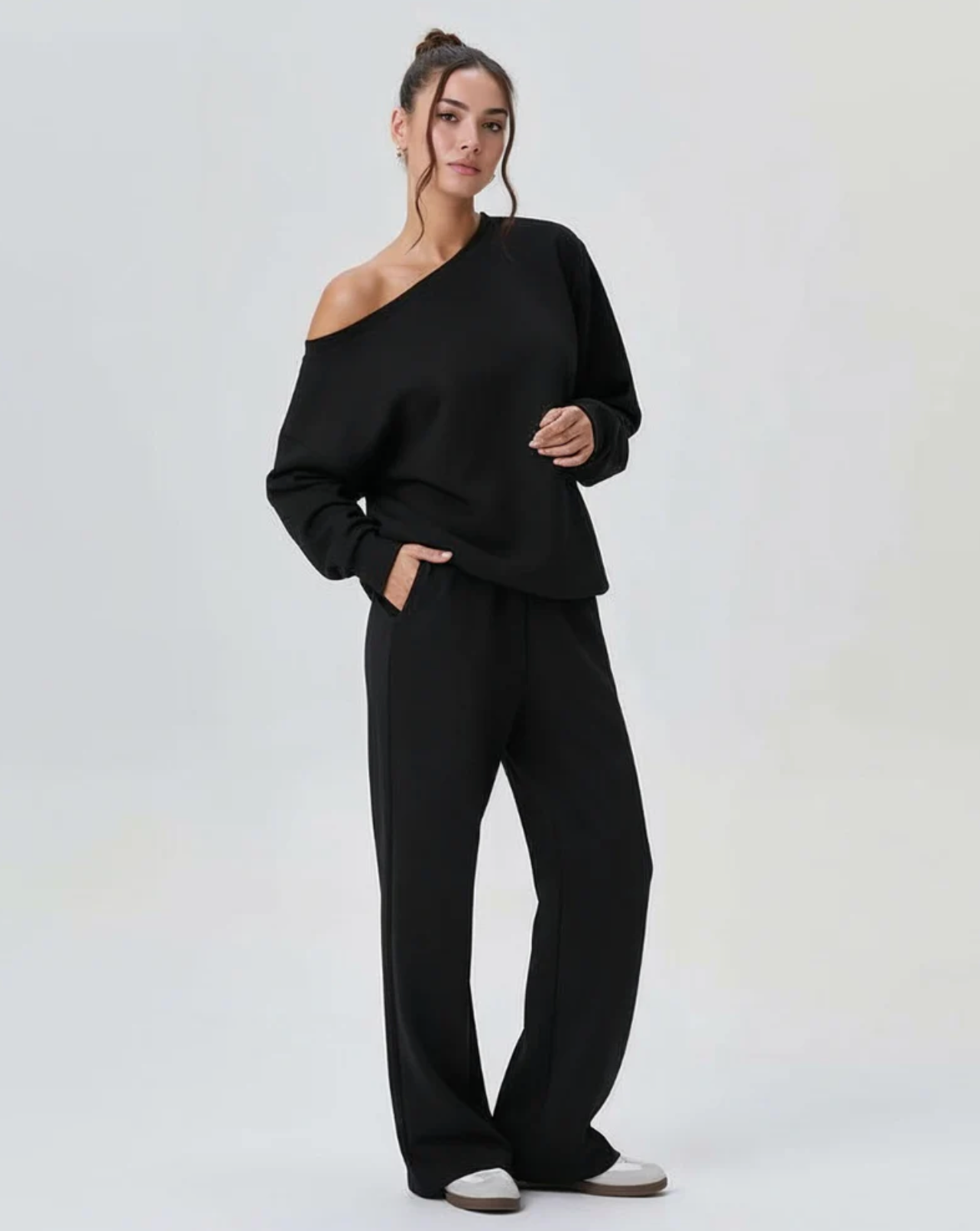 Step into effortless style and all-day comfort with the Oblique Leisure Set — a chic two-piece tracksuit designed to flatter your shape while keeping you cozy. The off-shoulder top adds a touch of playful elegance, while the relaxed pants provide the perfect balance of comfort and style.